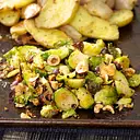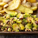 Remove the baking sheet from the oven, toss Brussels sprouts and hazelnuts with the browned butter and sprinkle with salt and pepper.